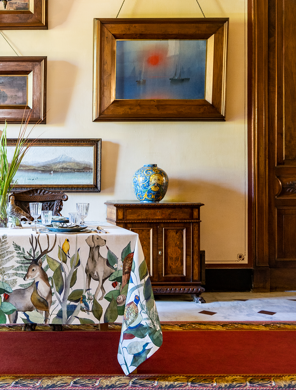 Italian linen tablecloth with the most stunning pattern of a woodland setting featuring dogs, deer, hare and pheasants.